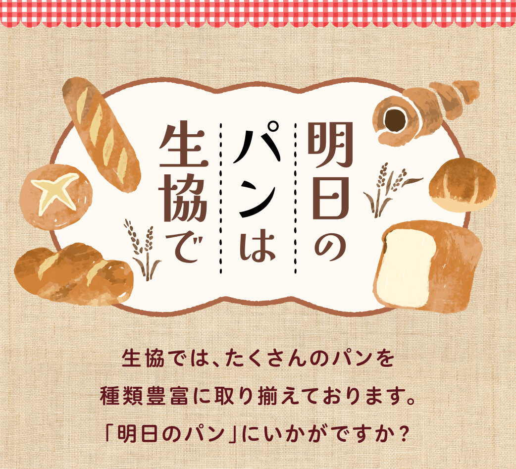 生協では、たくさんのパンを種類豊富に取り揃えております。「明日のパン」にいかがですか?