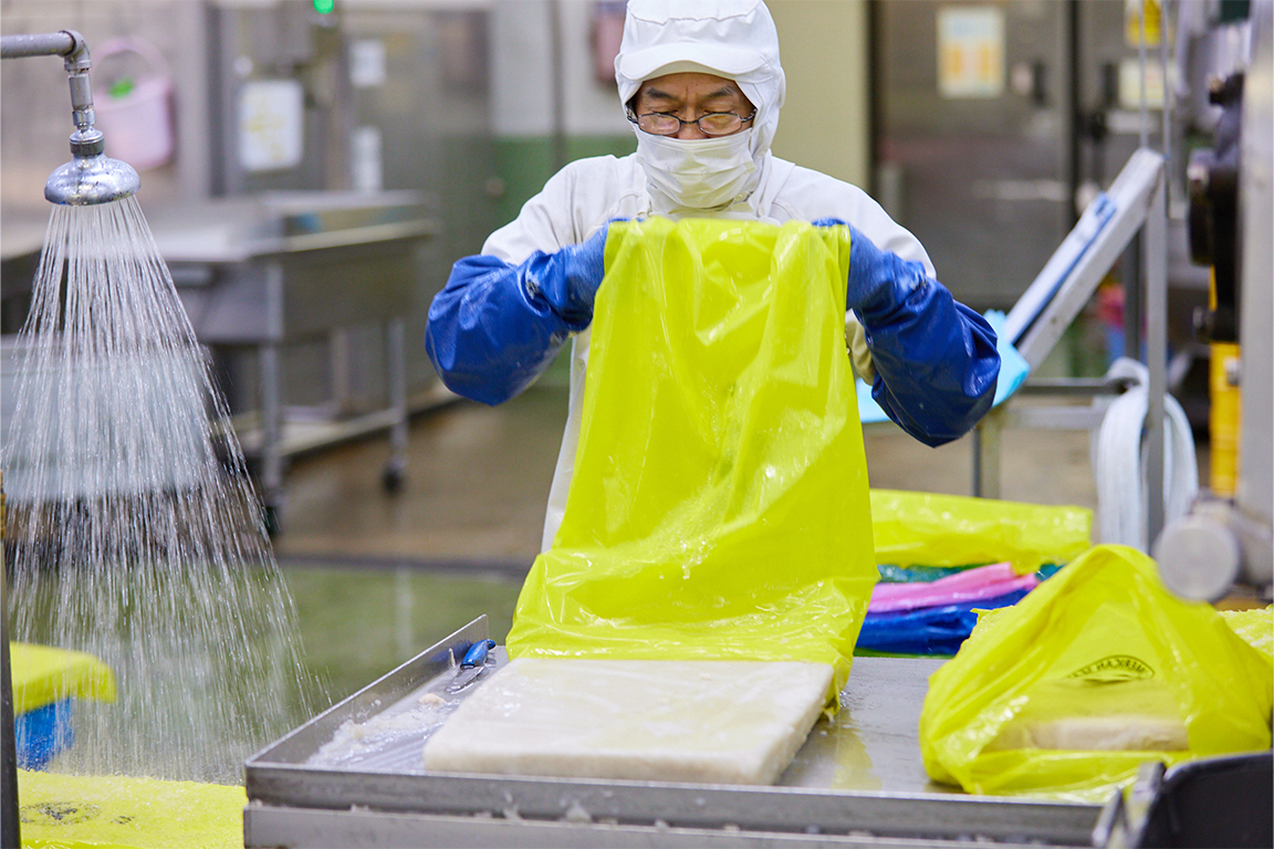 「二代目社長の杉野芳人が、昆布からとれるアルギン酸で人工クラゲを造ろうと開発を進めていましたが、一年かけた研究の末、商品化には至りませんでした。ですが、その失敗作の食感がカニに似ていることに気づきました。人工クラゲは失敗したけれど、カニはいけるんじゃないかと。とはいえ、カニの味や香りをつけるために試行錯誤を繰り返しましたし、カニ身の繊維質を再現するのは一番難しかったそうです」と村中工場長。