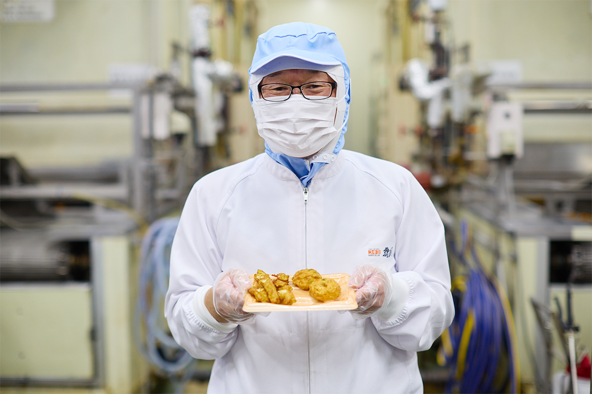 「2009年頃、『野菜を使った揚げかまぼこを、より手軽に召し上がっていただきたい』と開発したのが、野菜ちぎり天シリーズです。特にコープの組合員さんへお届けする『国産野菜ちぎり天』には国産の野菜を使用し、手に取りやすく、食べやすいという点にこだわりました。だから、あえて一粒あたりのサイズを小さく、1パックあたりの量も抑えた食べきりサイズを目指しました」。