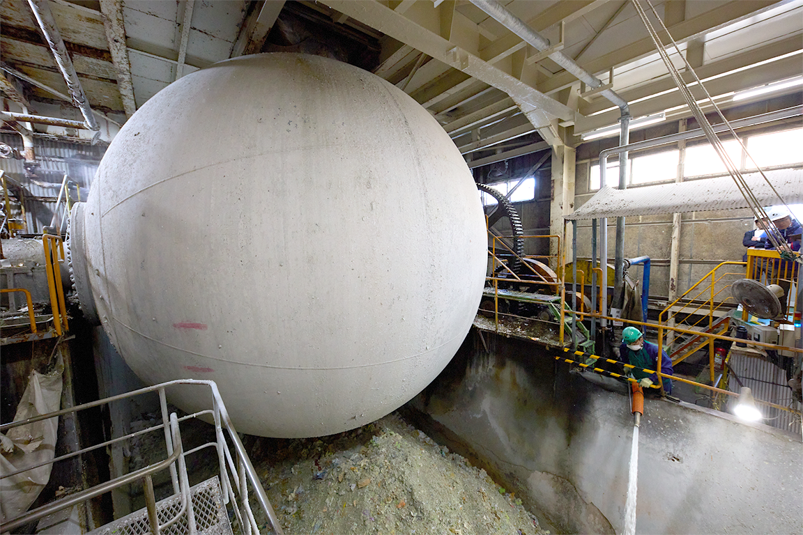 様々な原料が混ざった再生紙ですが、洗う際に漂白剤は使用していないのだそう。できるだけ白い原料を使用し、水のみで洗浄します。営業本部の神田さん曰く、「紙の洗浄には紙の量の150倍の水が必要。本来であればそれだけの量の水を用意するのは難しいけれど、丸富製紙では豊富な富士の伏流水で洗浄することで、漂白剤を使わなくても白く仕上げられているんです」とのこと。本社や工場、どこからでも見える雄大な富士山の恵みが、商品の品質に一役買っていました。