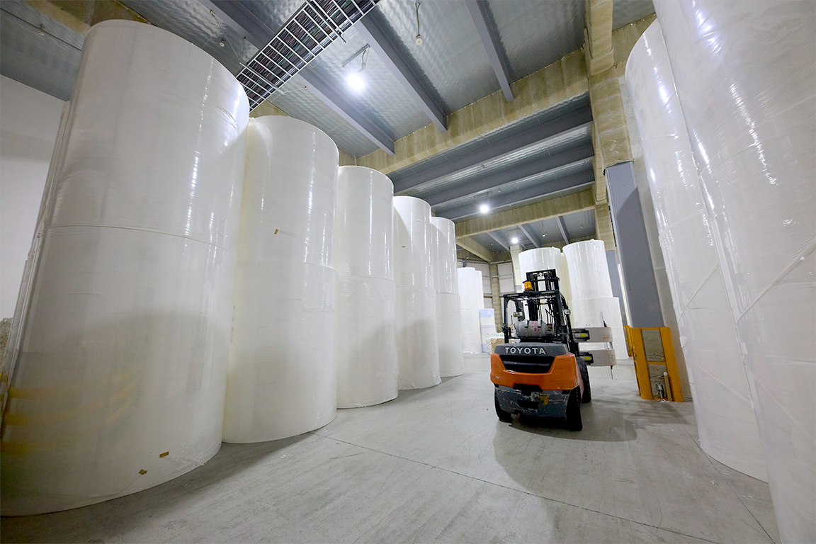 原紙ロール(直径1.6メートル!)が工場内にそびえたつ姿は圧巻!