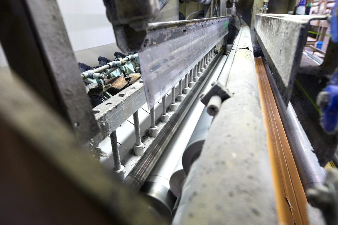 紙の原料は、牛乳パックや古紙をブレンドしたリサイクル原料100%。その中には、コープで集めた牛乳パックも使われています。自社工場に搬入したリサイクル原料を細かく裁断し、どろどろに溶かして不純物を洗い流したものを、紙をすく抄紙(しょうし)機でペーパーの形状に再生させていきます。