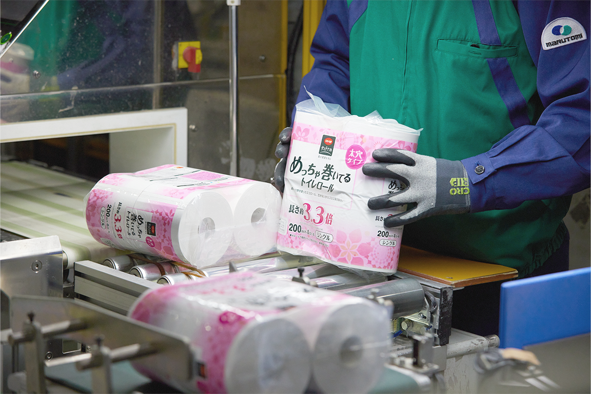 丸富製紙はもともと再生紙の製造メーカー。環境に良い商品づくりを、との理念は、約70年前の創業当時から掲げられていたと言います。「トイレットペーパーは、それ以降リサイクルができない最終紙。だからこそ再生紙を使用した環境に配慮したものを、とこだわっています」と神田さん。