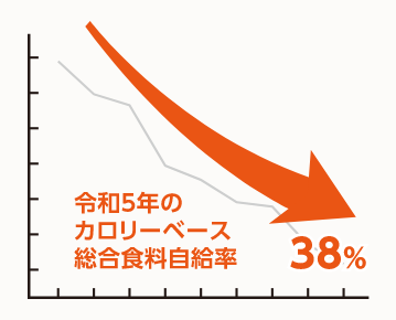 日本の食料自給率は 長期的にみると減少傾向です。輸入に頼ると、価格や確保する量が不安定になる等の問題があります。