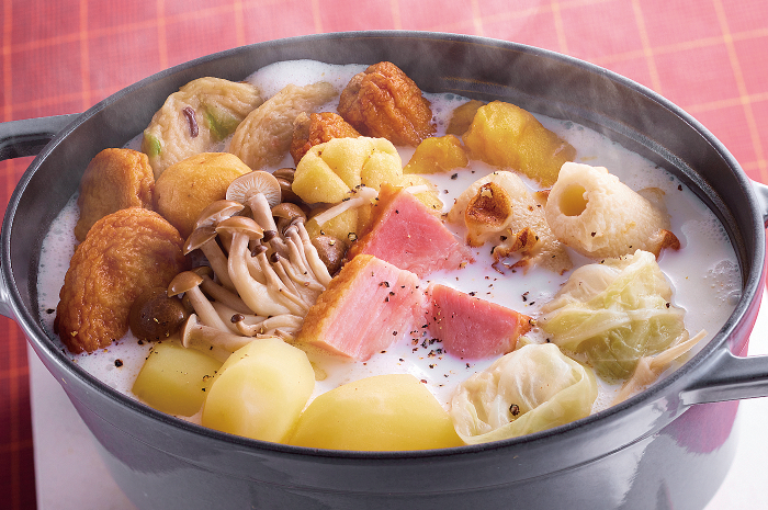 濃い目に希釈したスープで具材を煮込んだ後、牛乳を加えて。ブラックペッパーを振ればコクうま洋風おでんに。