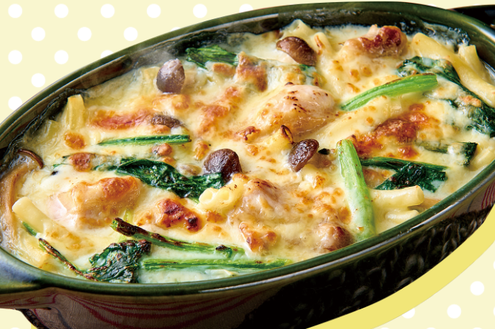 ① ゆでたマカロニ・ほうれん草、炒めた鶏肉・しめじ等の具材を耐熱容器に入れる。