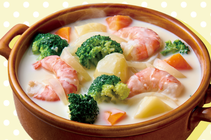 ② ゆでたお好みの具材(根菜、ブロッコリー、エビなど)を加えてひと煮する。