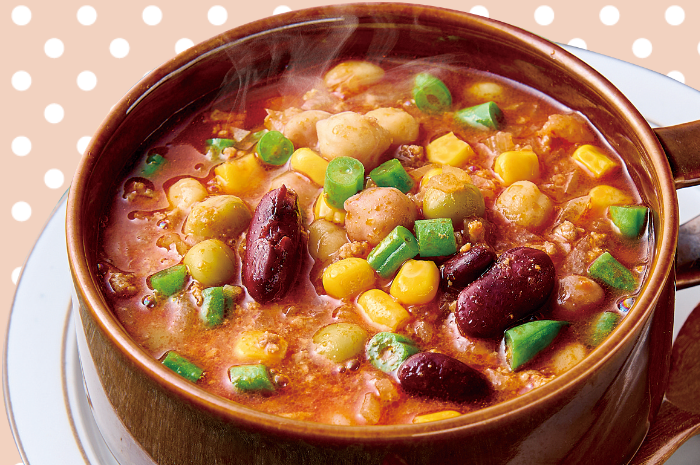 ② 粒コーン、ミックスビーンズ、いんげんなど、お好みの野菜を加えて煮込み、塩・こしょう少々で味を調える。