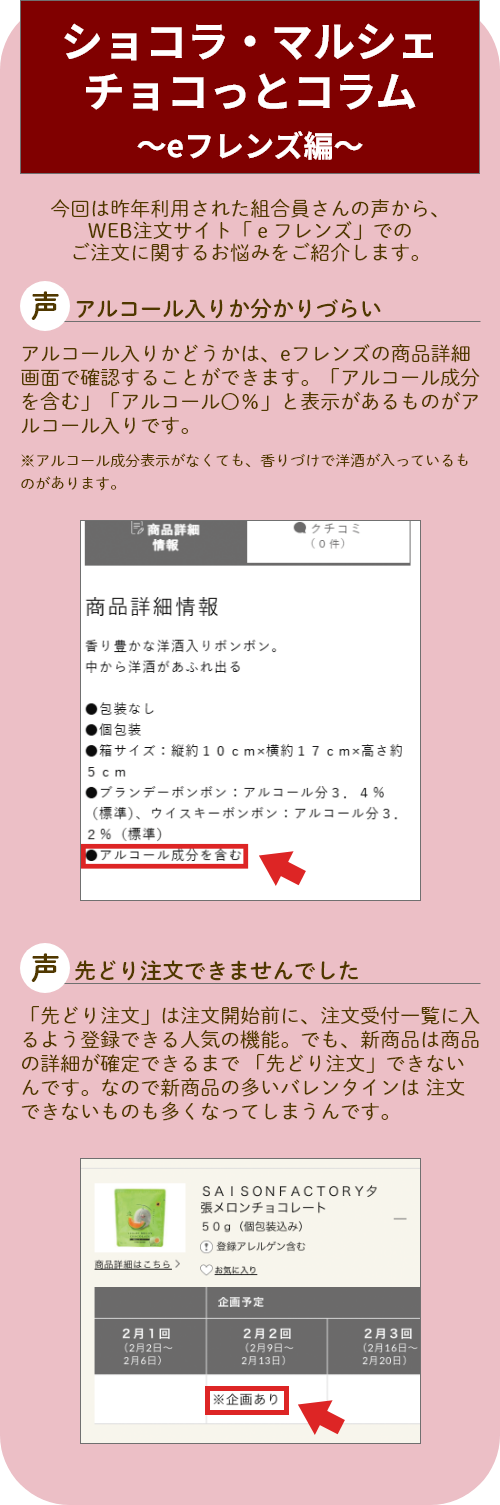 2回にわたってご紹介してきたコープのバレンタインチョコレートですが、ここでは紹介しきれなかった商品がまだまだたくさん!WEB注文サイト「eフレンズ」なら、価格別やタイプ別など検索機能が充実。手作り材料やおすすめのドリンクもあります。あなたにぴったりの商品を探して試してみてくださいね!