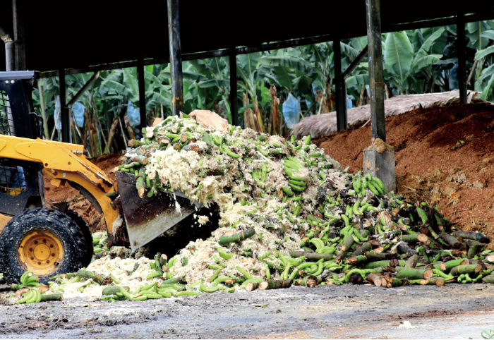 使用する堆肥(たいひ)は、規格外のバナナをムダなく活用した自家製有機質堆肥。化学肥料に頼らず、除草剤も使わず、バナナの栄養でバナナを育てるのが田辺流なのです。