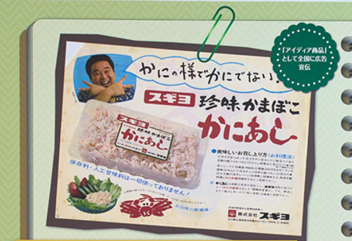 当時開発していた人工クラゲの失敗作がカニの身そっくりの口あたりだったことが、誕生のきっかけに。世界初のカニカマ販売へとつながり、その後大ヒットとなりました。