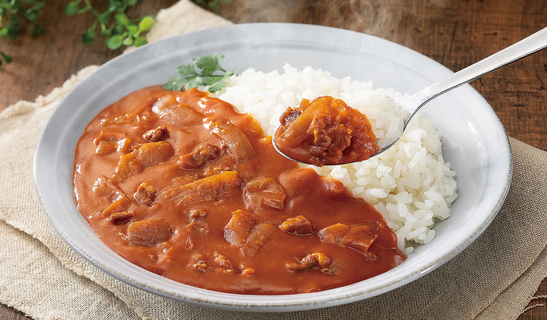 トマトで仕立てたコク深い味わいが特徴のソースに、牛肉と玉ねぎを加えたコク旨ハヤシライスソース。