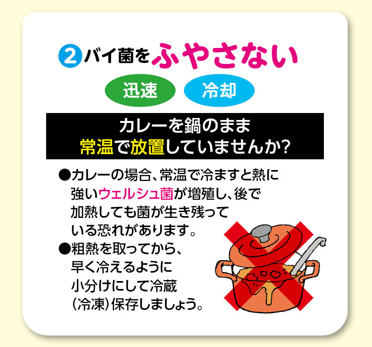 (2)バイ菌をふやさない 迅速・冷却 カレーを鍋のまま常温で放置していませんか? ●カレーの場合、常温で冷ますと熱に強いウェルシュ菌が増殖し、後で加熱しても菌が生き残っている恐れがあります。 ●粗熱を取ってから、早く冷えるように小分けにして冷蔵(冷凍)保存しましょう。