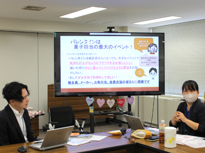 続いて、年中バレンタインのことを考え、生協限定ショコラに情熱を注ぐバイヤーたちが登場。バイヤー手作りの生協限定ショコラ一覧表を参考に、アンバサダーさんに商品を試食していただきました。今年のテーマは『ひとくちでしあわせ♡笑顔ひろがる』。バイヤーたちのチョコレートを通じて多くの人に幸せを届けたいという想いが、ビシビシと伝わったのではないでしょうか。