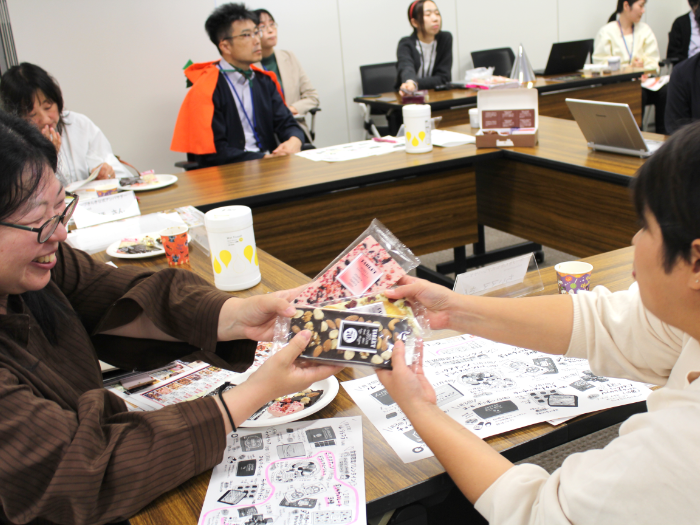10月23日(木)、コープきんき事務所にて開催された"ショコラマルシェお披露目会"に、第1期~第3期のアンバサダーさん計4名にご参加いただきました。ショコラマルシェお披露目会へのアンバサダーさんの参加は今回で2回目となります。日頃からメッセージでのやり取りはあるものの、このように直接お会いできる機会はなかなかありません。「お会いできてうれしいです~!」などの声が飛び交う和気あいあいとした雰囲気の中、イベントがスタートしました。